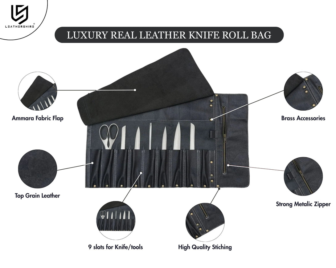 Made in Top Grade Real Cow Hide Naked Leather. Top Quality Workmanship. Material: 100% Full Grain Leather. There are 2 adjustable buckles 9 deep pockets and 1 YKK Zip Pocket handmade Lightweight Simple to Clean comfortable leather handle high quality Leather Adjustable Shoulder Strap Colour Taiga Black fine quality leather easy to Use easy to walk Cool gift for your loved ones who loves professional and Luxury Gift. Leather Roll will last for years because of high quality. One internal Pockets for needy things Best Christmas Gift