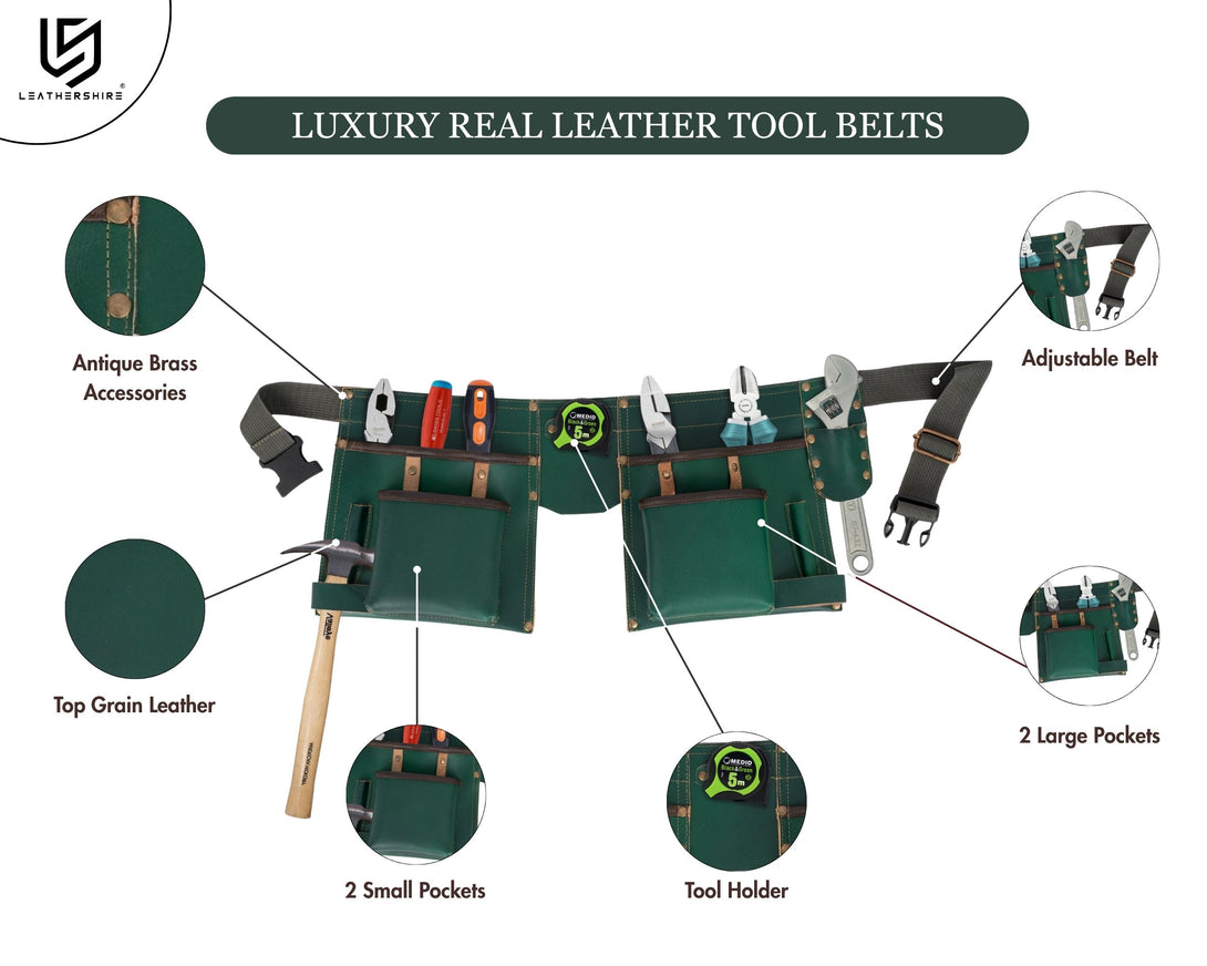 Store your tools in style with our premium Classic Tool Belt, crafted from high-quality Green Leather. This belt features 10 pockets in varying sizes to hold your essential tools,along with a tool-holding pouch and 3 tool-holding loops in different sizes.