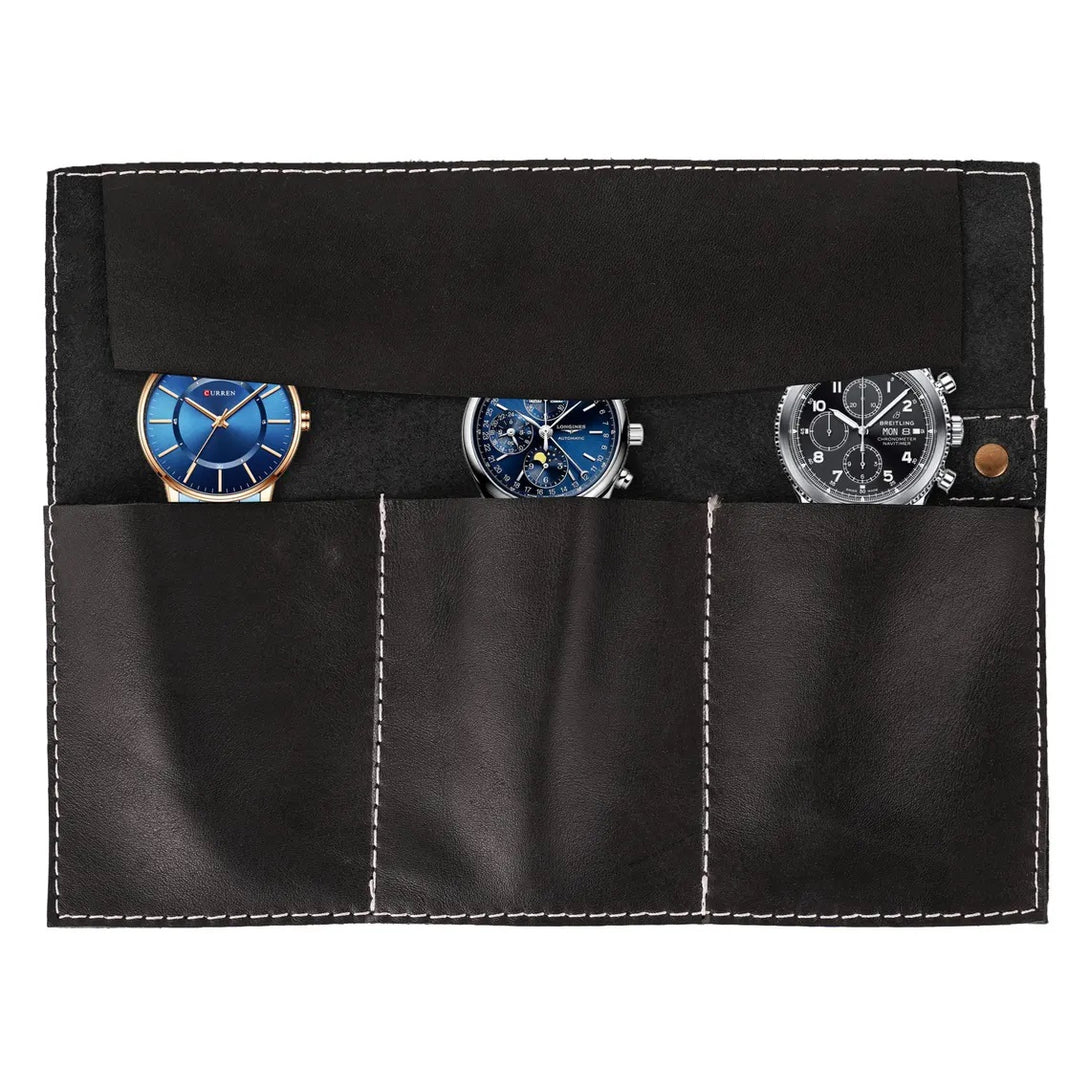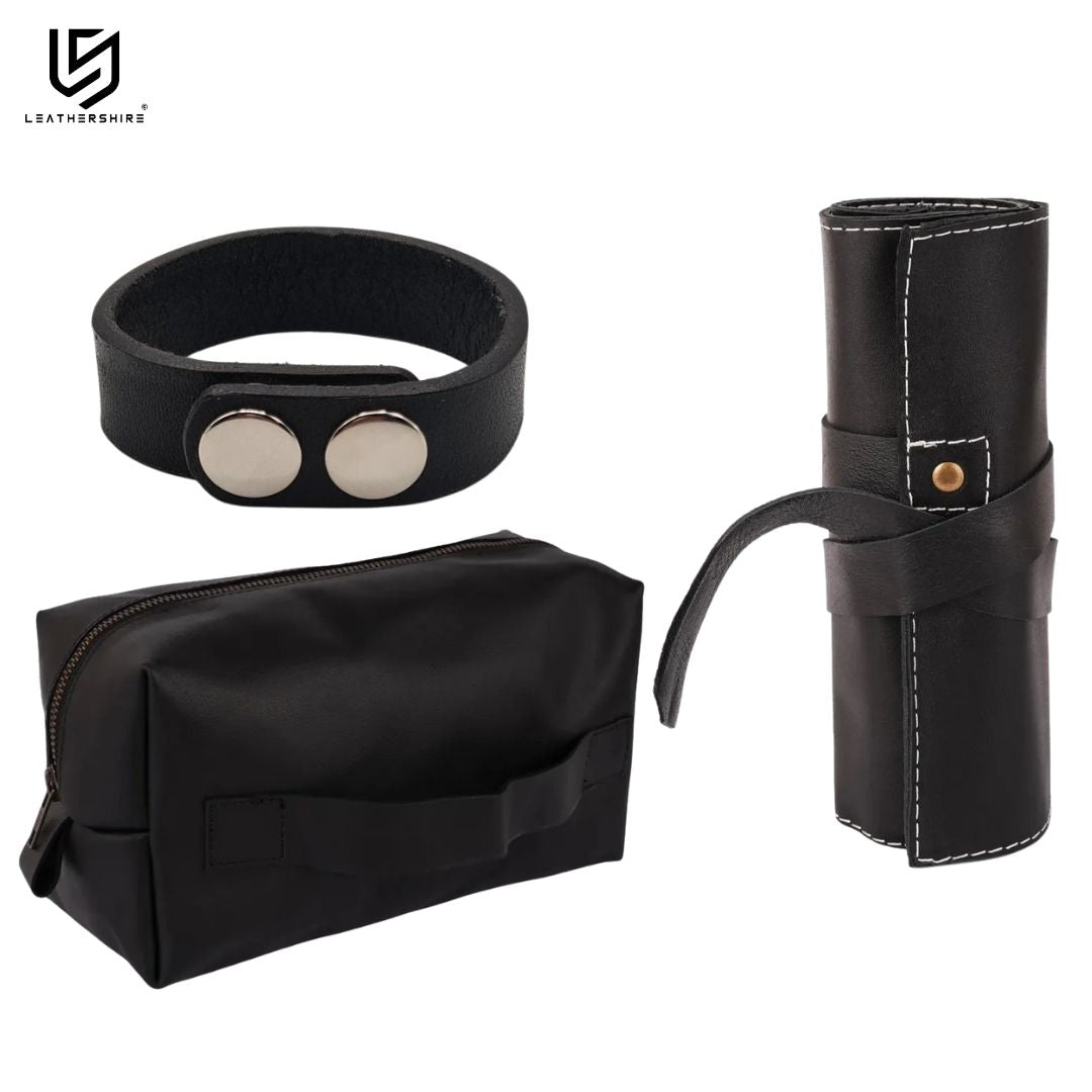 The Signature Men’s Grooming Set (3-in-1) Leather Black Watch Roll with Leather Wristband & Leather Shaving Bag