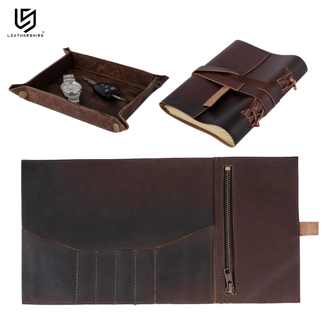 The Leather Lovers Stationery Set (3-in-1) Leather Green Journal with Leather Pencil Roll & Leather Tray